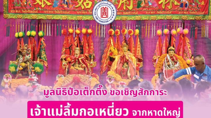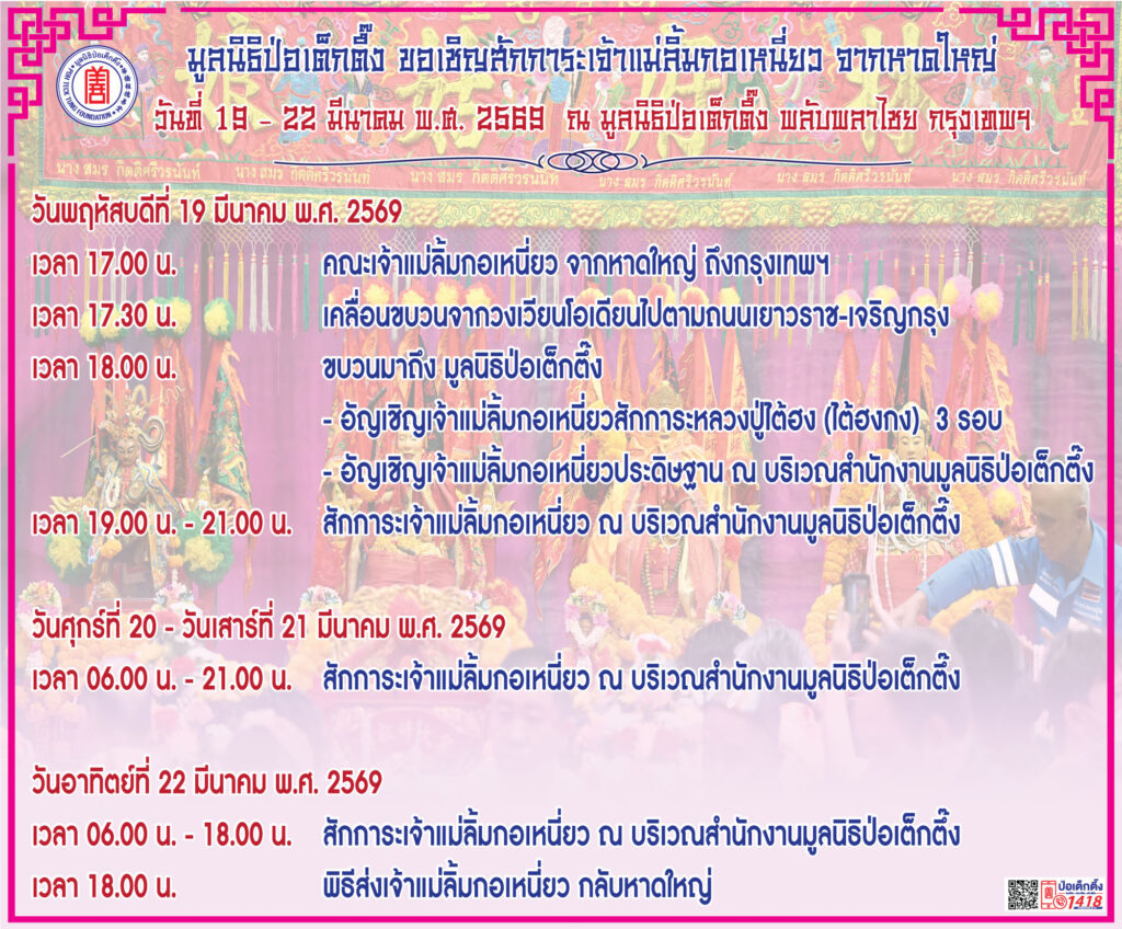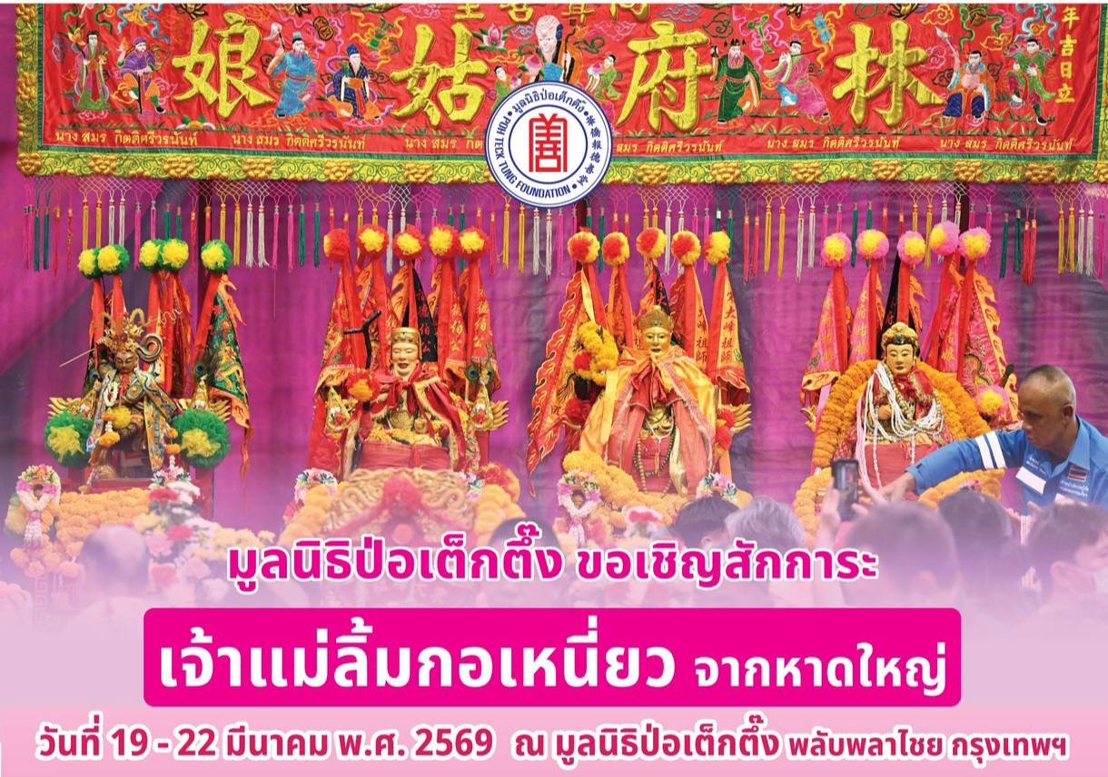ระหว่างวันที่ 19 – 22 มีนาคม พ.ศ. 2569 มูลนิธิป่อเต็กตึ๊ง ร่วมกับมูลนิธิมิตรภาพสามัคคี (ท่งเซียเซี่ยงตึ๊ง) หาดใหญ่ ขอเชิญศิษยานุศิษย์ และสาธุชนที่เลื่อมใส ร่วมสักการะองค์เจ้าแม่ลิ้มกอเหนี่ยวจากหาดใหญ่ องค์หลวงปู่ไต้ฮงโจวซือ องค์ฮกเต็กแป๊ะกง และองค์นาจาไท้จื้อ (เทพโกมินทร์) ณ บริเวณลานสำนักงาน มูลนิธิป่อเต็กตึ๊ง พลับพลาไชย กรุงเทพฯ โดยในวันพฤหัสบดีที่ 19 มีนาคม พ.ศ. 2569 เวลาประมาณ 17.00 น. คณะเจ้าแม่ลิ้มกอเหนี่ยวเดินทางถึงกรุงเทพฯ เคลื่อนขบวนผ่านบริเวณวงเวียนโอเดียน ไปตามถนนเยาวราช เจริญกรุง โดยขบวนจะแห่ถึงมูลนิธิป่อเต็กตึ๊ง และเปิดให้ผู้มีจิตศรัทธาเข้าสักการะ เวลาประมาณ 18.00 น. และในวันศุกร์ที่ 20 มีนาคม – วันเสาร์ที่ 21 มีนาคม พ.ศ. 2569 มูลนิธิป่อเต็กตึ๊งเปิดให้ผู้มีจิตศรัทธาเข้าสักการะตั้งแต่เวลา 06.00 – 21.00 น. สำหรับวันอาทิตย์ที่ 22 มีนาคม พ.ศ. 2569 เวลาประมาณ 18.00 น. จะมีพิธีส่งเจ้าแม่ลิ้มกอเหนี่ยวกลับหาดใหญ่