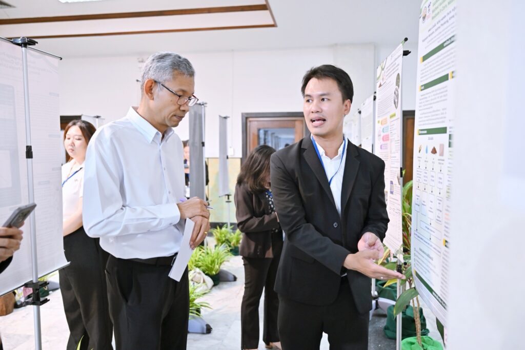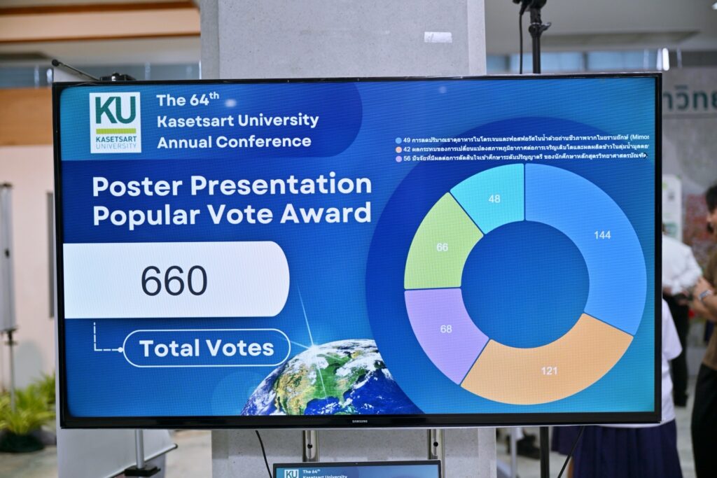 ภาคบ่าย ดร.ดำรงค์ ศรีพระราม รักษาการแทนอธิการบดีมหาวิทยาลัยเกษตรศาสตร์ เป็นประธานเปิดการนำเสนอผลงานภาคโปสเตอร์ จำนวน 58 เรื่อง ณ บริเวณโถงหน้าห้องประชุมสุธรรม อารีกุล อาคารสารนิเทศ 50 ปี มก. พร้อมนำผู้บริหารเยี่ยมชมการนำเสนอผลงานภาคโปสเตอร์ และมีผู้ได้รับรางวัลคะแนนโหวตสูงสุด 3 รางวัล และรางวัล Committee Choice ดังนี้