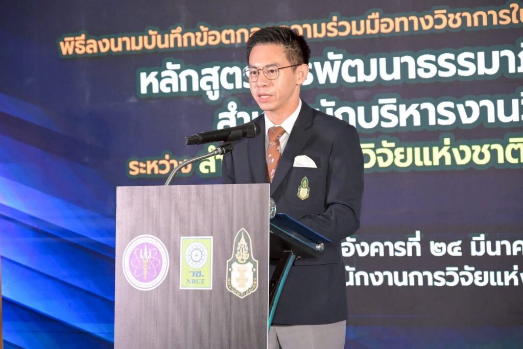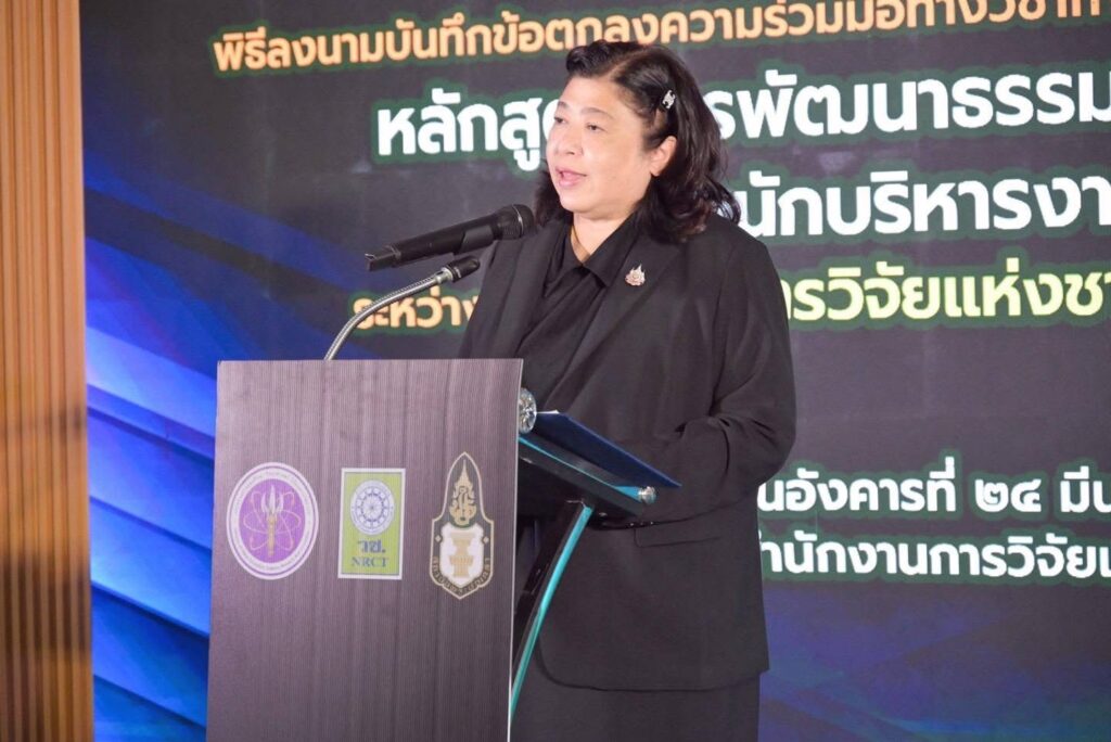 ดร.วิภารัตน์ ดีอ่อง ผู้อำนวยการสำนักงานการวิจัยแห่งชาติกล่าวว่าวช. ในฐานะหน่วยงานที่มีบทบาทในการส่งเสริมและพัฒนาบุคลากรด้านการวิจัยและนวัตกรรมของประเทศตระหนักว่าความเข้มแข็งของระบบวิจัยขึ้นอยู่กับคุณภาพของบุคลากรผู้บริหารจัดการระบบซึ่งมีหน้าที่เชื่อมโยงนโยบายสู่การปฏิบัติกำกับดูแลทรัพยากรสาธารณะและผลักดันให้งานวิจัยก่อประโยชน์ต่อประเทศและประชาชนอย่างเป็นรูปธรรมโดยหลักสูตรการพัฒนาธรรมาภิบาลและจริยธรรมสำหรับนักบริหารงานวิจัยมืออาชีพภายใต้บันทึกข้อตกลงฉบับนี้จะมุ่งเชื่อมโยงหลักการสู่การปฏิบัติผ่านการวิเคราะห์สถานการณ์จริงการแลกเปลี่ยนประสบการณ์และกรณีศึกษาเพื่อพัฒนานักบริหารงานวิจัยให้เป็นมืออาชีพควบคู่กับการยึดมั่นในธรรมาภิบาลและจริยธรรมอันจะส่งผลต่อการยกระดับคุณภาพระบบวิจัยของประเทศให้มีความโปร่งใสคุ้มค่าและได้รับความเชื่อมั่นจากสังคมทั้งในระดับประเทศและนานาชาติ