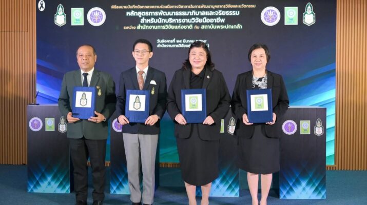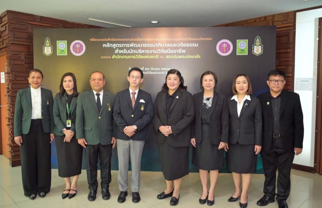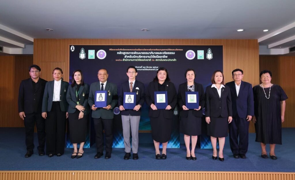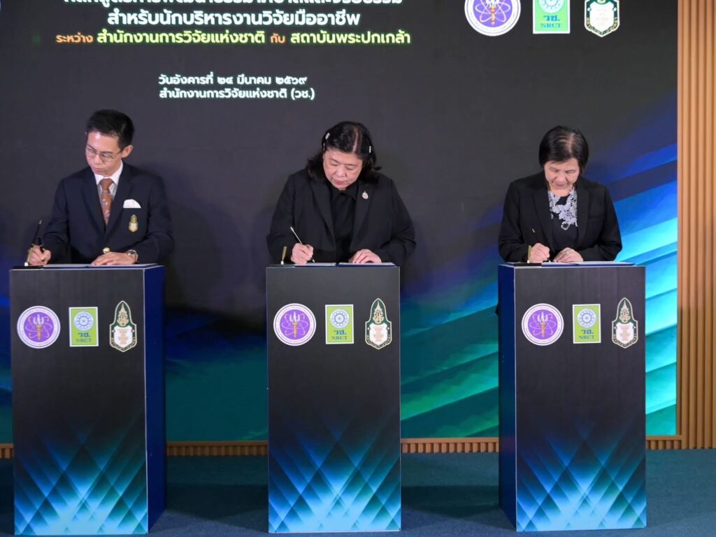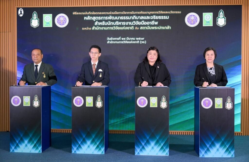 วันที่ 24 มีนาคม 2569 สำนักงานการวิจัยแห่งชาติ(วช.) กระทรวงการอุดมศึกษา วิทยาศาสตร์ วิจัยและนวัตกรรม จัดพิธีลงนามบันทึกข้อตกลงความร่วมมือทางวิชาการในการพัฒนาบุคลากรวิจัยและนวัตกรรม ภายใต้หลักสูตรการพัฒนาธรรมาภิบาลและจริยธรรมสำหรับนักบริหารงานวิจัยมืออาชีพ ระหว่างสำนักงานการวิจัยแห่งชาติกับสถาบันพระปกเกล้า โดยได้รับเกียรติจาก ดร.วิภารัตน์ ดีอ่อง ผู้อำนวยการสำนักงานการวิจัยแห่งชาติ กล่าวถึงความร่วมมือในการพัฒนาบุคลากรวิจัยและนวัตกรรม และ รองศาสตราจารย์ ดร.อิสระ เสรีวัฒนวุฒิ เลขาธิการสถาบันพระปกเกล้า กล่าวถึงแนวทางสนับสนุนความร่วมมือ พร้อมด้วย คณะผู้บริหารสถาบันพระปกเกล้าและผู้บริหาร วช. เข้าร่วมในพิธี ณ ห้องประชุมจอมพลสฤษดิ์ธนะรัชต์ อาคาร วช.1