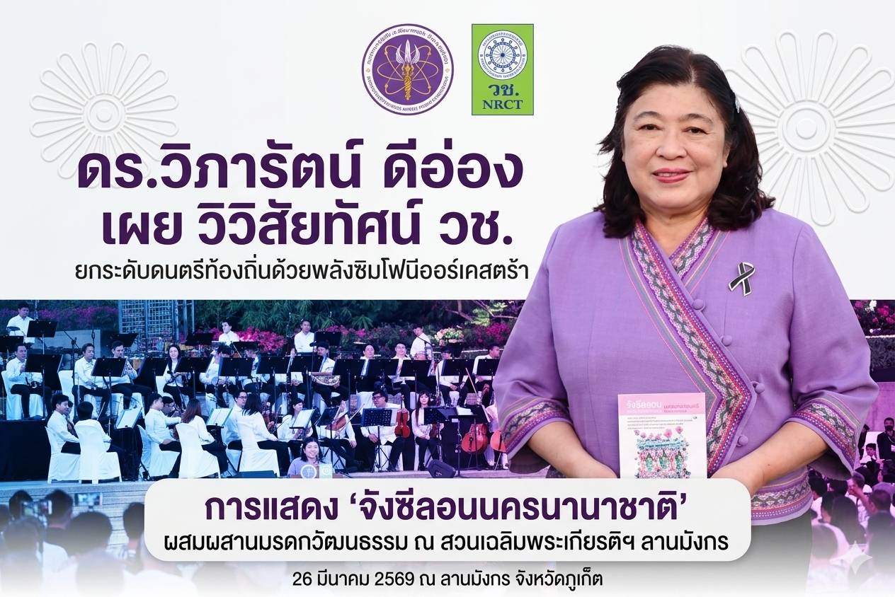 วันที่26 มีนาคม2569 สำนักงานการวิจัยแห่งชาติ(วช.) กระทรวงการอุดมศึกษาวิทยาศาสตร์วิจัยและนวัตกรรมส่งเสริมและสนับสนุนมูลนิธิอาจารย์สุกรีเจริญสุขจัดการแสดง“จังซีลอนนครนานาชาติความเป็นนานาชาติที่ภูเก็ตอยู่ในเสียงดนตรี“ ภายใต้โครงการวิจัยดนตรีประจำชาติเพื่อพัฒนาศักยภาพความเป็นเลิศและพัฒนาทรัพยากรมนุษย์ผ่านดนตรีสร้างคนดนตรีและวัฒนธรรมดนตรีให้เป็นวัฒนธรรมนานาชาติโดย ดร.วิภารัตน์ ดีอ่อง ผู้อำนวยการสำนักงานการวิจัยแห่งชาติเป็นประธานกล่าวเปิดการแสดงพร้อมนี้รศ.ดร.สุกรี เจริญสุข อำนวยการแสดง, นายศุภโชคละอองเพชรนายกเทศมนตรีนครภูเก็ตกล่าวถึงวัตถุประสงค์ของการจัดงาน, นายเรวัตอารีรอบนายกองค์การบริหารส่วนจังหวัดภูเก็ตกล่าวต้อนรับโดยมีผู้บริหารส่วนท้องถิ่นและประชาชนในพื้นที่เข้าร่วมชมการแสดงณสวนเฉลิมพระเกียรติ72 พรรษามหาราชินี(ลานมังกร) จังหวัดภูเก็ต