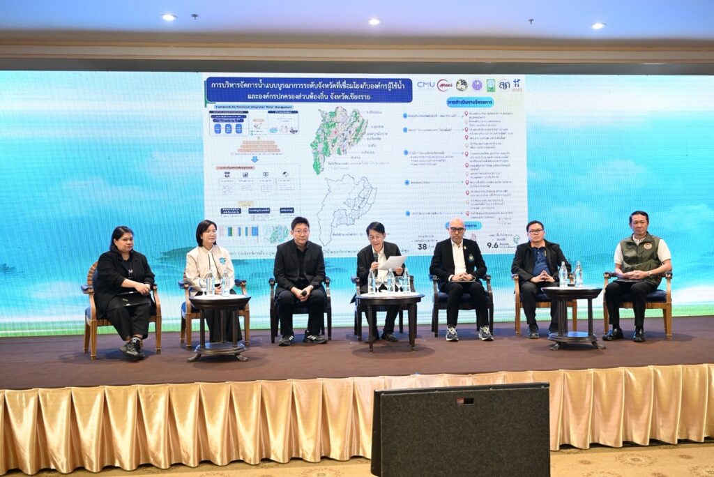 ต่อมา เป็นกิจกรรมเสวนา “มุ่งเป้าอนาคตประเทศไทยเพื่ออากาศสะอาด จังหวัดเชียงราย – พะเยา : การบูรณาการความร่วมมือสู่การปฏิบัติในพื้นที่เพื่อแก้ปัญหา PM2.5” โดย ผศ.ดร.วีรชัย อาจหาญ กล่าวถึงประเด็นการจัดการเศษวัสดุทางการเกษตร, ศ.ปฏิบัติ ดร.เศรษฐ์ สัมภัตตะกุล กล่าวในประเด็นผลกระทบต่อสุขภาพ: ห้องลดฝุ่นกับกลุ่มเปราะบาง, รศ.ดร.ดุสิต อธินุวัฒน์ ประเด็นภาพรวมและการบูรณาการเครือข่ายความร่วมมือ พร้อมด้วย ผู้แทนกลุ่มผู้ใช้ประโยชน์จากงานวิจัยและนวัตกรรม นายทนงศักดิ์ ทองแสน นายกเทศมนตรีตำบลจันจว้า, ดร.นณธภัทร ธีระวรรธนะสิริ นักวิชาการสาธารณสุขชำนาญการ, นายชลกฤษ ฟองสายชล บริษัท สยาม คอฟฟี่ เทรด จำกัด และดำเนินการเสวนาโดย ดร.วิจารย์ สิมาฉายา คณะกรรมการส่งเสริมแผนงานเป้าหมายสำคัญตามยุทธศาสตร์ ววน. และการเสวนา “มุ่งเป้าอนาคตประเทศไทยเพื่อน้ำมั่นคง จังหวัดเชียงราย – พะเยา : พลังความร่วมมือท้องถิ่นสู่การจัดการน้ำมั่นคง“ โดย ดร.อังกูร ว่องตระกูล ในประเด็นน้ำท่วมเมือง: เตือนเร็ว หนีทัน ป้องกันภัยในเขตเมือง, ดร.ณัฏฐพร พิมพะ ในประเด็นน้ำประปา: มาตรฐานน้ำประปา แก้ปัญหาสารหนู, ดร.สุดารัตน์ อุทธารัตน์ ในประเด็นน้ำตำบล: การจัดการน้ำชุมชนตำบลพึ่งตนเอง พร้อมด้วย ผู้แทนกลุ่มผู้ใช้ประโยชน์ นายอนันต์ เพ็ชร์หนู ผู้อำนวยการสำนักงานทรัพยากรน้ำแห่งชาติ, นายประพัฒน์ สีธิ สำนักงานป้องกันและบรรเทาสาธารณภัยจังหวัดเชียงราย, นายไพรัช มหาวงศนันท์ กองสาธารณสุข องค์การบริหารส่วนจังหวัด จังหวัดเชียงราย ดำเนินการเสวนาโดย รศ.ดร.สุจริต คูณธนกุลวงศ์ ผู้อำนวยการแผนงาน “น้ำมั่นคง ไม่ท่วม ไม่แล้ง ใน 10 จังหวัด”