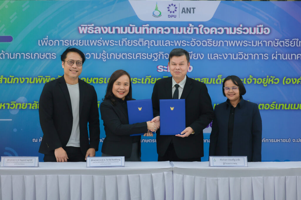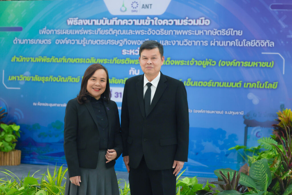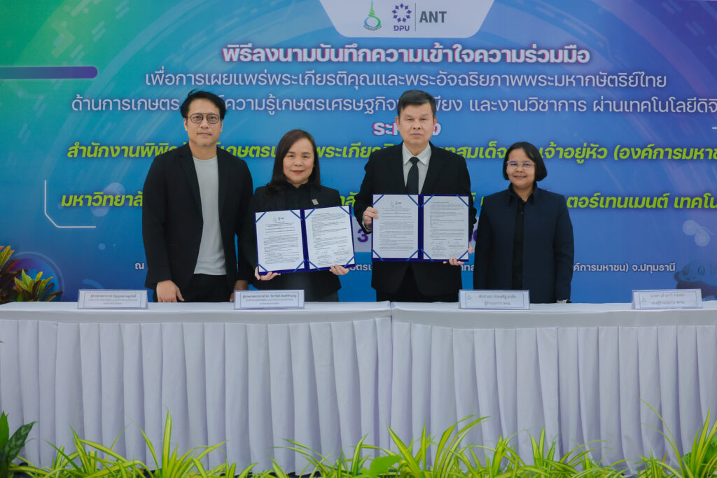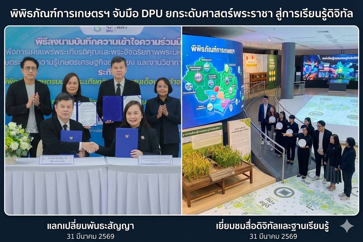 วันที่ 31 มีนาคม 2569 สำนักงานพิพิธภัณฑ์เกษตรเฉลิมพระเกียรติพระบาทสมเด็จพระเจ้าอยู่หัว (องค์การมหาชน) จัดพิธีลงนามบันทึกความเข้าใจความร่วมมือ (MOU) ร่วมกับ มหาวิทยาลัยธุรกิจบัณฑิตย์ โดยวิทยาลัยครีเอทีฟดีไซน์ แอนด์ เอ็นเตอร์เทนเมนต์เทคโนโลยี เพื่อร่วมกันพัฒนาและเผยแพร่พระเกียรติคุณและพระอัจฉริยภาพพระมหากษัตริย์ไทยด้านการเกษตร องค์ความรู้เกษตรเศรษฐกิจพอเพียง และงานวิชาการ ผ่านเทคโนโลยีดิจิทัล ความร่วมมือครั้งนี้มุ่งยกระดับพิพิธภัณฑ์สู่ “แหล่งเรียนรู้เกษตรเศรษฐกิจเชิงดิจิทัล” ที่ทันสมัย โดยจะพัฒนา สื่อดิจิทัล นวัตกรรมการเรียนรู้ และกิจกรรมเชิงประสบการณ์ เพื่อให้ประชาชนสามารถเข้าถึงองค์ความรู้ได้ง่าย สนุก และนำไปใช้ได้จริง