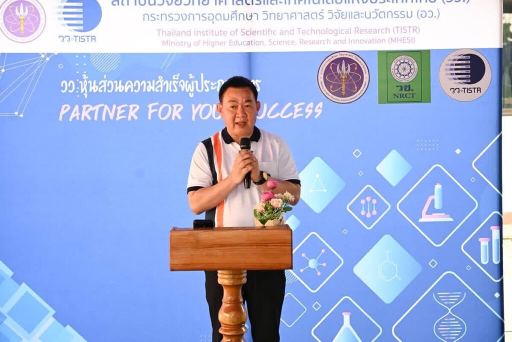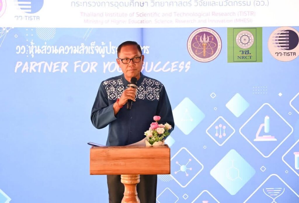 ในโอกาสนี้ ดร.วิภารัตน์ ดีอ่อง ผู้อำนวยการสำนักงานการวิจัยแห่งชาติ ร่วมกล่าวสนับสนุนการพัฒนานวัตกรรม และผศ.ดร.วีรชัย อาจหาญ ผู้ว่าการสถาบันวิจัยวิทยาศาสตร์และเทคโนโลยีแห่งประเทศไทย กล่าวรายงาน พร้อมนี้ นายประสงค์ หล้าอ่อน รองผู้ว่าราชการจังหวัดเชียงราย กล่าวต้อนรับ ณ ศูนย์ฝึกอบรมและสาธิตการแปรรูปวัสดุชีวภาพเพื่อการใช้ประโยชน์ระดับชุมชนวัดหนองปึ๋ง ตำบลจันจว้าใต้ อำเภอแม่จัน จังหวัดเชียงราย