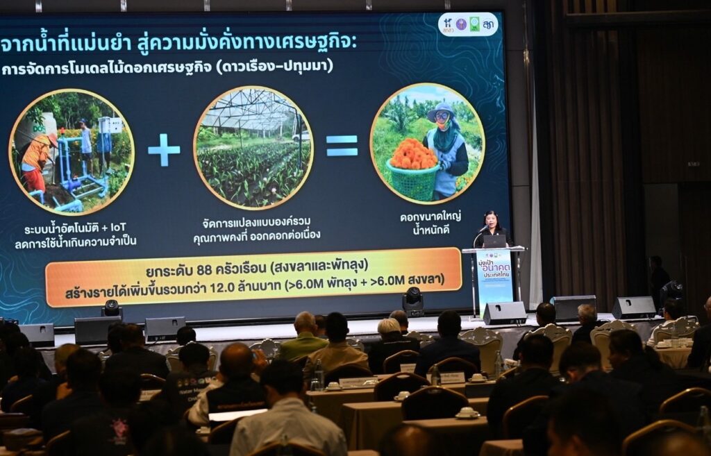 นายชูชีพ ธรรมเพชร รองผู้ว่าราชการจังหวัดสงขลา กล่าวว่า เวทีมุ่งเป้าอนาคตประเทศไทยเพื่อน้ำมั่นคง ตอนที่ 3 จังหวัดสงขลา – พัทลุง เป็นความร่วมมือสำคัญของหน่วยงานวิจัย ภาครัฐ และท้องถิ่น เพื่อร่วมกันแก้ปัญหาน้ำในพื้นที่ให้เกิดความมั่นคงและยั่งยืน โดยพื้นที่ลุ่มน้ำทะเลสาบสงขลามีความสำคัญทางเศรษฐกิจและระบบนิเวศ แต่เผชิญปัญหาน้ำท่วม น้ำแล้ง และน้ำเค็มรุก เนื่องจากลักษณะน้ำ 3 ระบบ (น้ำจืด น้ำกร่อย น้ำเค็ม) และการระบายน้ำที่ซับซ้อน ซึ่งการนำนวัตกรรมและงานวิจัยเข้ามาช่วยบริหารจัดการน้ำ ทำให้สามารถลดความเสี่ยงภัยพิบัติ เพิ่มความมั่นคงด้านน้ำ และยกระดับคุณภาพชีวิตของประชาชนได้ ความร่วมมือครั้งนี้จึงเป็นต้นแบบสำคัญในการพัฒนาการจัดการน้ำของภาคใต้ และสามารถต่อยอดสู่พื้นที่อื่นของประเทศได้อย่างยั่งยืน