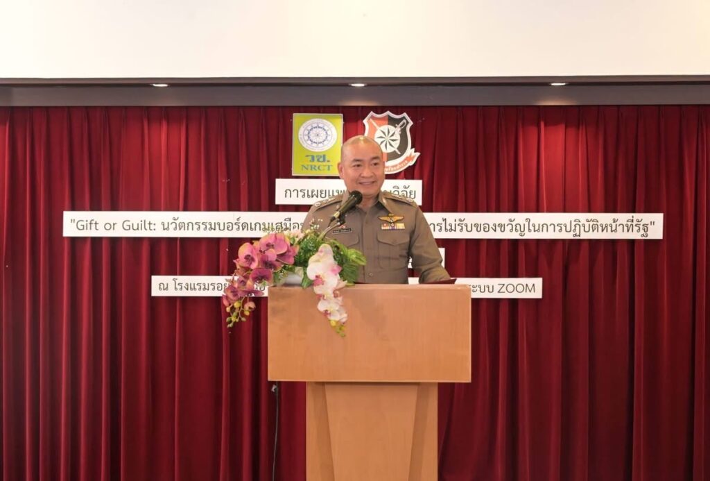 วันที่ 17 เมษายน 2569 สำนักงานการวิจัยแห่งชาติ (วช.) กระทรวงการอุดมศึกษา วิทยาศาสตร์ วิจัยและนวัตกรรม ร่วมกับ โรงเรียนนายร้อยตำรวจ จัดกิจกรรมเผยแพร่ผลงานวิจัย “Gift or Guilt: นวัตกรรมบอร์ดเกมเสมือนเพื่อเสริมสร้างมาตรการไม่รับของขวัญในการปฏิบัติหน้าที่รัฐ” โดยมี พันตำรวจโท วิชิต อาษากิจ เป็นหัวหน้าโครงการ ซึ่งได้รับเกียรติจาก ศาสตราจารย์ พลตำรวจตรี ดร.ชัชนันท์ ลีระเติมพงษ์ รองผู้บัญชาการโรงเรียนนายร้อยตำรวจ เป็นประธาน พร้อมด้วยคณะนักวิจัยและผู้แทนหน่วยงานภาคีเครือข่าย เข้าร่วม ณ โรงแรมรอยัล ริเวอร์ กรุงเทพฯ